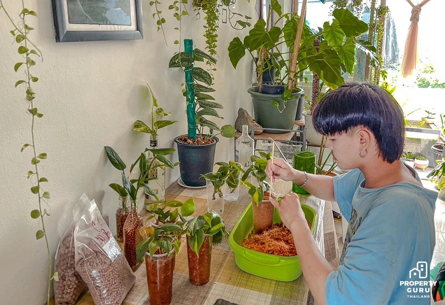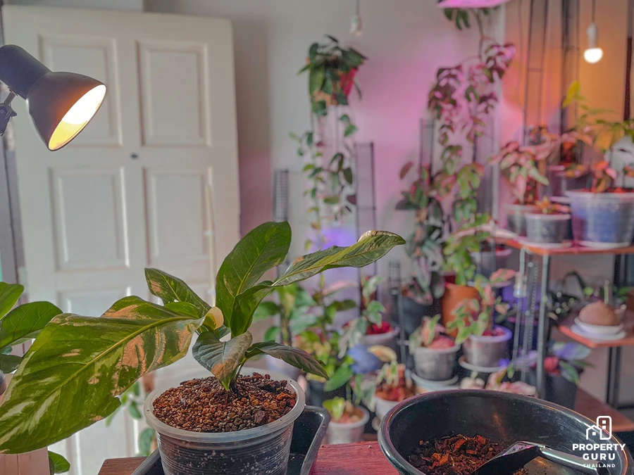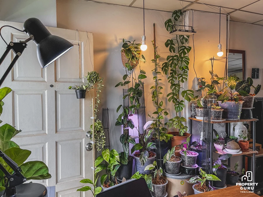 "ส่วนอีกปัญหาคือเรื่องฝุ่นที่เกิดจากต้นไม้พวกนี้ต้องทำใจ ทำความสะอาดทุกเช้าครับ (หัวเราะ) แต่อีก 1 ปัญหาเวลาปลูกต้นไม้ในห้องที่ผมอยากจะแชร์คือเรื่องอากาศในห้อง ต้องถ่ายเท ไม่อับร้อน และเรื่องของแสงด้วย บางครั้งเรื่องของแสงและความสว่างในห้องอาจจะไม่เพียงพอ แต่โชคดีที่ห้องผมได้รับแสงเช้าและแสงเย็น ส่วนใครที่อยากจะปลูกแต่แสงไม่เพียงพอ Plant Grow Light เป็นตัวช่วยที่ดีเลยครับ ส่วนตัวชอบและน้องโตไวมากครับ"