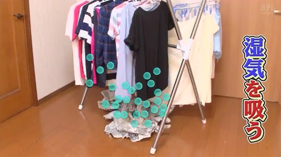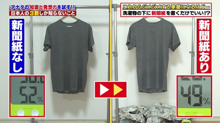 การนำหนังสือพิมพ์มาขยำไว้ใต้ราวตากผ้าวเป็นทริคแม่บ้านญี่ปุ่น ที่ช่วยทำให้ผ้าแห้งไวขึ้น เพราะหนังสือพิมพ์จะดูดความชื้นจากผ้ามาไว้ที่กระดาษนั่นเอง จากภาพข้างบนจะเป็นการทดลองตากเสื้อแบบมีหนังสือพิมพ์และไม่มีหนังสือพิมพ์ ผลปรากฏว่าแบบมีหนังสือพิมพ์มีความชื้นเหลืออยู่น้อยกว่า เมื่อแห้งไวก็ทำให้ผ้าไม่อับ และกลิ่นจากผงซักฟอก น้ำยาปรับผ้านุ่ม ก็จะชัดขึ้น ทำให้เสื้อหอมติดทนทั้งวันค่ะ ใครจะทำวิธีนี้ต้องให้ผ้าหมาดจนไม่มีน้ำหยดแล้วนะคะ ไม่เช่นนั้นน้ำก็จะไปหยดใส่กองหนังสือพิมพ์ทำให้ประสิทธิภาพการดูดความชื้นทำได้น้อยลง