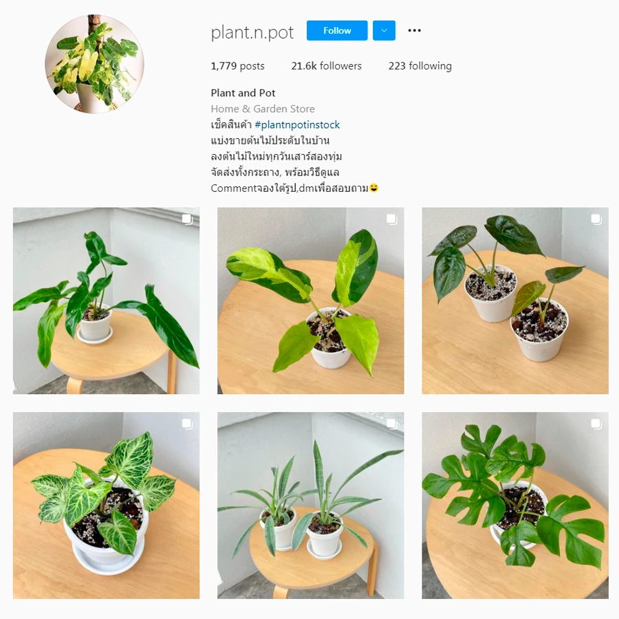 ร้าน Plant.n.pot ขายต้นไม้ประดับในบ้าน เน้นไม้ใบมีให้เลือกหลากหลายสายพันธุ์พร้อมให้สายเขียวและสายไม้ด่างรับไปดูแล ไม่ว่าจะเป็น ต้นลีลาวดีใบด่าง, มอนสเตอร่าเลื้อย, ฟิโลใบเลื่อยสีทอง, ปอทะเลด่าง, ต้น Calathea musaica ฯลฯ ลงต้นไม้ใหม่ทุกวันเสาร์สองทุ่ม จัดส่งทั้งกระถาง พร้อมคำแนะนำวิธีการดูแลต้นไม้จากทางร้าน จะนำไปวางตรงไหนของห้องก็ดีงามทั้งนั้น สามารถนัดรับได้ในเขตกรุงเทพและปริมณฑล ราคามีให้เลือกตั้งแต่หลักร้อยไปจนถึงหลักหมื่น ตัวอย่างราคาต้นไม้