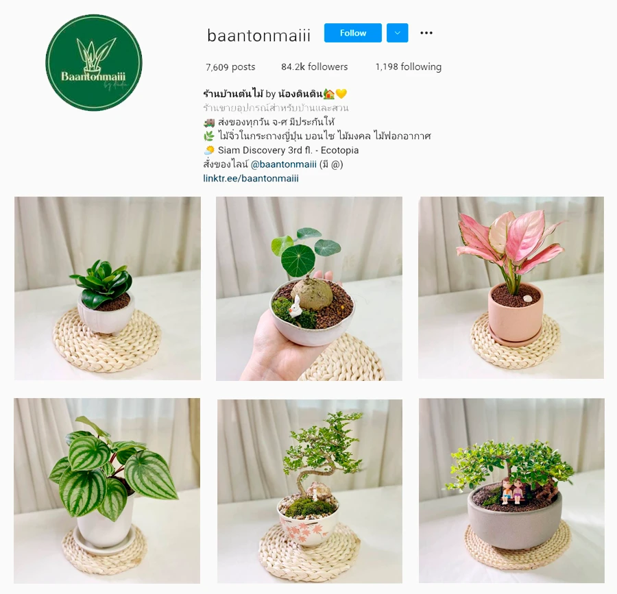 ปิดท้ายด้วยร้านต้นไม้ไซส์มินิสุดน่ารักอีกร้าน baantonmaiii สำรับสายที่ชอบต้นไม้แบบต้นเล็กต้นน้อย มีทั้งต้นไม้จิ๋ว ต้นบอนไซ ต้นไม้มงคล ต้นไม้ฟอกอากาศ เอาไว้ตั้งบนโต๊ะทำงานเพิ่มความสดชื่น แต่ละต้นทางร้านเค้าจัดลงไว้ให้ในกระถางเก๋ไก๋สไตล์ญี่ปุ่น ซื้อไปปุ๊บสามารถนำไปตั้งปั๊บได้เลยแบบสวยๆ พร้อมแนะนำวิธีดูแลต้นไม้ให้ด้วย ทางร้านส่งของทุกวันจันทร์-ศุกร์ ไม่ต้องรอนาน ตัวอย่างราคาต้นไม้ อาทิ