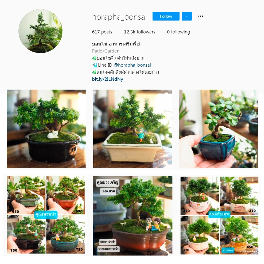 ใครที่ชื่นการบอนไซต้องหลงรักร้านนี้ horapha_bonsai เพราะมีบอนไซให้เลือกเยอะมาก แถมยังมีตุ๊กตาจิ๋วตกแต่งให้สวนจิ๋วที่น่ารักอยู่แล้วดูน่ามองเพิ่มขึ้นไปอีก ใครอยากได้ผลิตภัณฑ์บำรุงต้นไม้ หรือกระถางต้นไม้สวยๆ ร้านนี้ก็มีขายครบ พร้อมบอกวิธีการเลี้ยงดู และยังมีบริการจัดส่งแมสเซนเจอร์ ในเขตกรุงเทพและปริมณฑลด้วย สะดวกมากๆ ราคาเริ่มต้นที่หลักร้อย เช่น