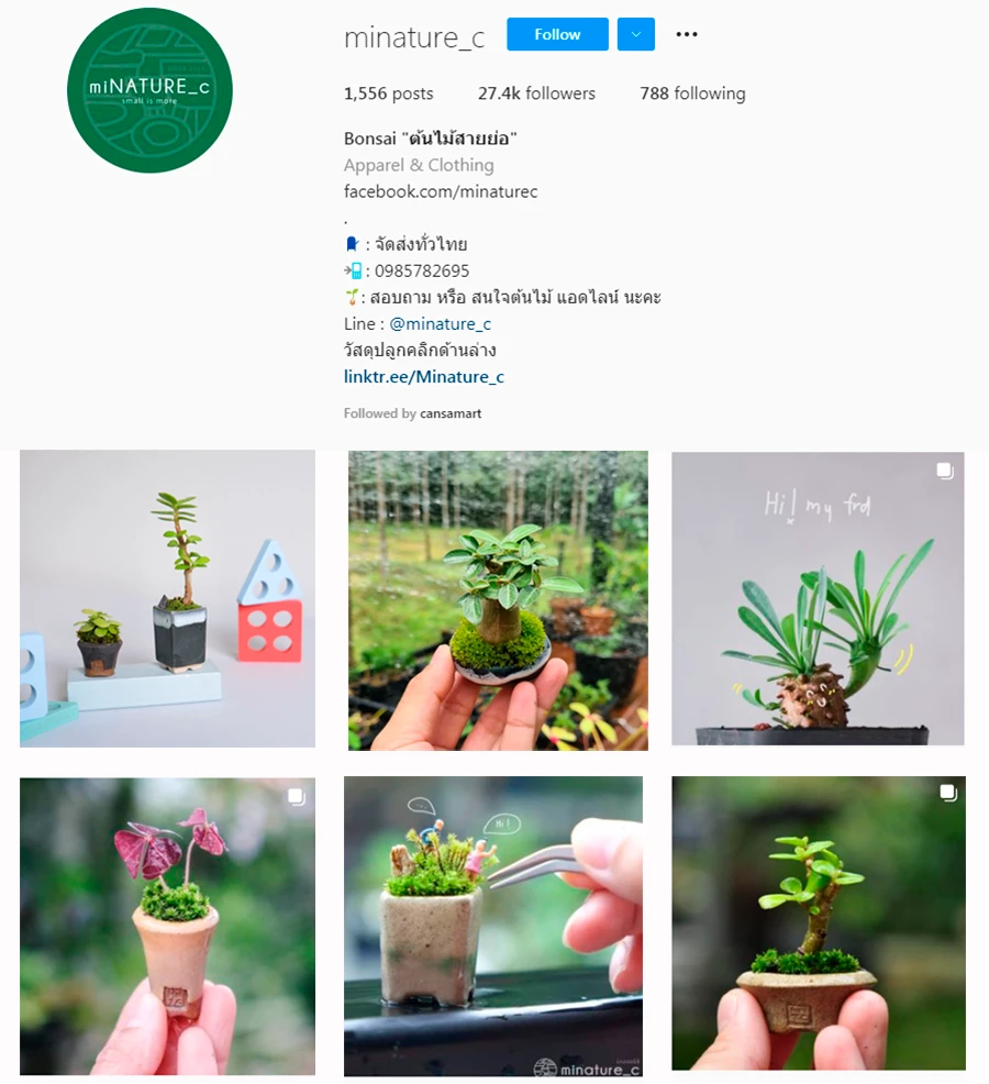 สายต้นไม้จิ่วต้องถูกใจร้านนี้ minature_c เพราะต้นไม้ของเค้าเป็นต้นไม้สายย่อ หลากหลายสายพันธ์ อาทิ บอนไซ กระบองเพชร ปลูกอยู่ในกระถางจิ๋ว เรียกว่าใช้พื้นที่ในการปลูกน้อยมาก จะนำไปตั้งตรงไหนของห้องก็น่ารัก นอกจากนี้ยังมีสวนขวดแก้ว กระถางต้นไม้ที่ทางร้านออกแบบเอง รวมไปถึงโมเดลตุ๊กตาสำหรับตกแต่ง ดิน ปุ๋ย ลวดดับนไซ ที่นี่มีขายครบหมด เพื่อให้คุณลูกค้าได้มีสวนจิ๋วน่ารักๆ อยู่เคียงข้างได้ในทุกๆ วัน ตัวอย่างราคาต้นไม้ เช่น