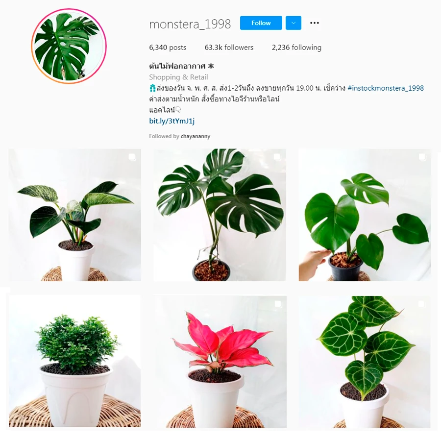 ขึ้นชื่อว่าร้าน monstera_1998 ก็แน่นอนว่าส่วนใหญ่จะขาย Monstera ซึ่งได้ขึ้นชื่อว่าเป็น "ราชินีแห่งใบไม้" เป็นหลัก แต่ละต้นมีรูปทรงของใบที่สวยงามเป็นเอกลักษณ์ มีถิ่นกำเนิดอยู่ในเขตร้อนชื้นในทวีปอเมริกา และยังจัดเป็นต้นไม้ฟอกอากาศเหมาะกับคนที่เป็นโรคภูมิแพ้ แต่ต้นไม้สายพันธุ์อื่นที่นอกเหนือจาก Monstera ร้านนี้ก็มีขายเช่นกันนะคะ พร้อมแนะนำวิธีการปลูก มือใหม่ที่ไม่เคยปลูกต้นไม้ก็สามารถปลูกได้ ราคาก็ไม่แพงเริ่มต้นที่ร้อยนิดเท่านั้น ตัวอย่างราคาต้นไม้