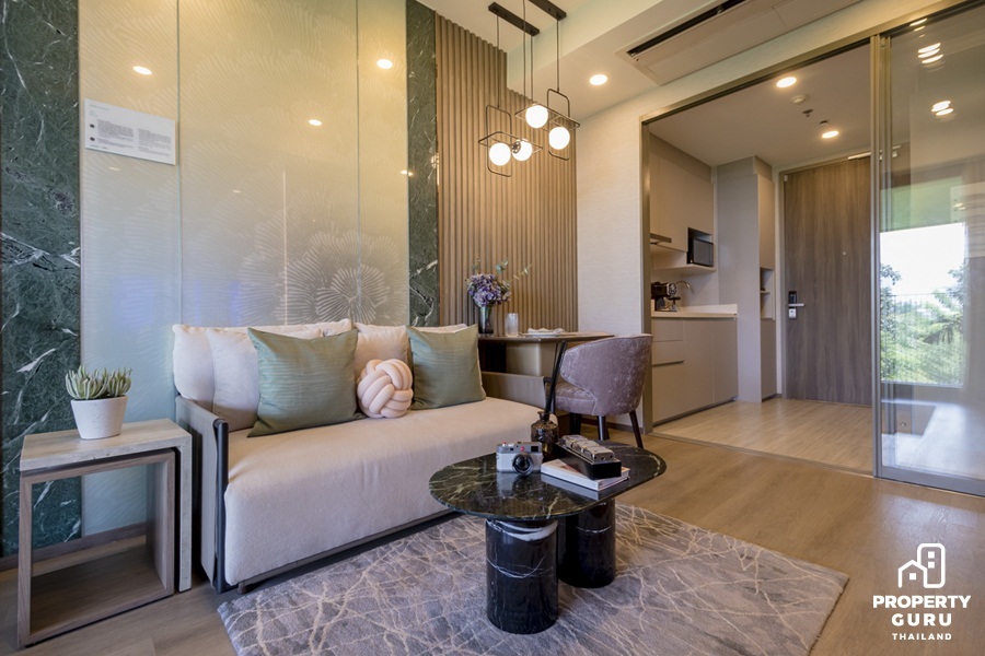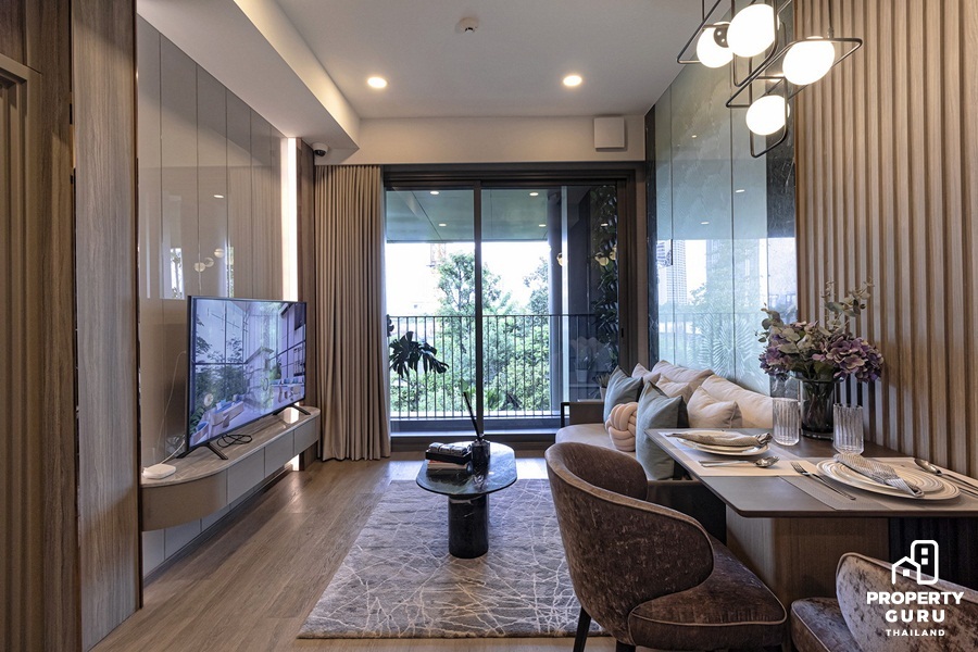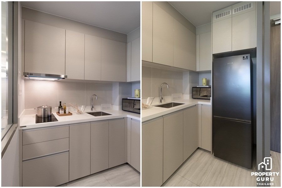ห้องตัวอย่างแบบ 1 Bedroom ขนาด 40.74 ตร.ม. จัดวางรูปแบบฟังก์ชันการใช้งาน ให้เหมาะกับการใช้ชีวิตของคู่รักหรือครอบครัวที่กำลังมีลูกเล็ก พร้อมระบบ Home Automation ขายแบบ Fully Fitted ได้ชุดครัว Built-in, สุขภัณฑ์ในห้องน้ำ และตู้เสื้อผ้า Built-in