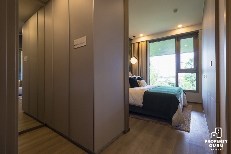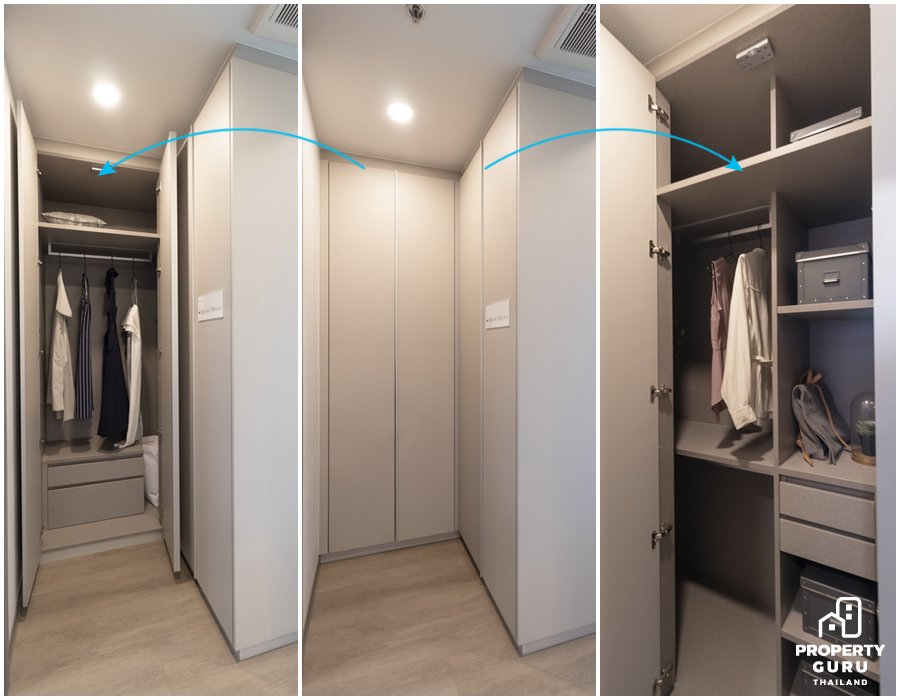 ตู้เสื้อผ้า Built-in ดีไซน์พิเศษมีความลึกมากถึง 70 ซม. สามารถเก็บกระเป๋าเดินทางได้ พร้อมที่แขวนเดรสและเสื้อตัวยาวได้โดยที่ไม่ต้องกลัวยับ