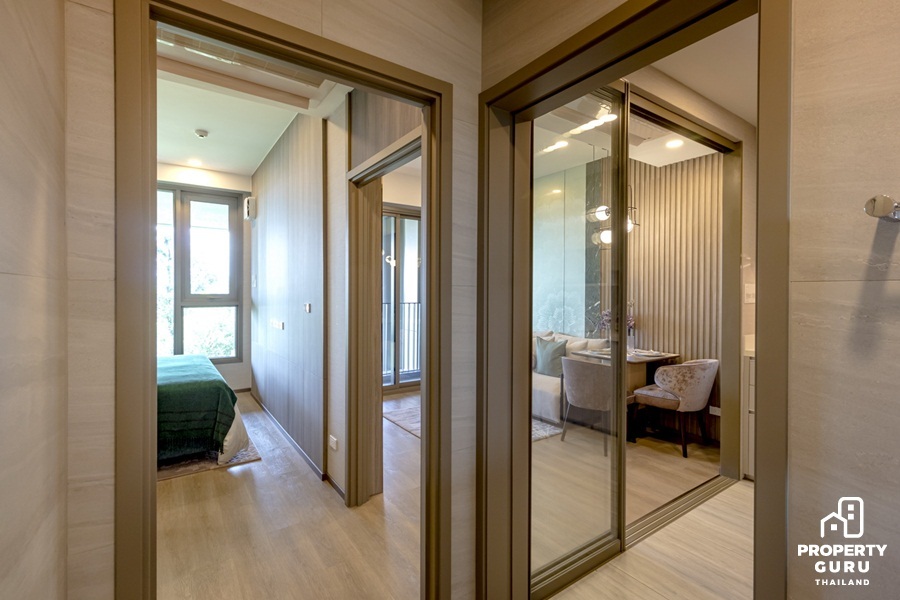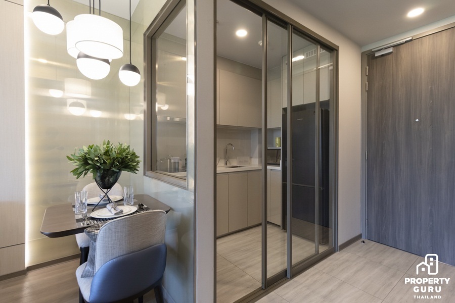 Type นี้ออกแบบเป็นครัวปิด ตกแต่งผนังด้วยกระจกบานใหญ่ พร้อมประตูกระจกบานเลื่อนทำให้ห้องดูโปร่ง