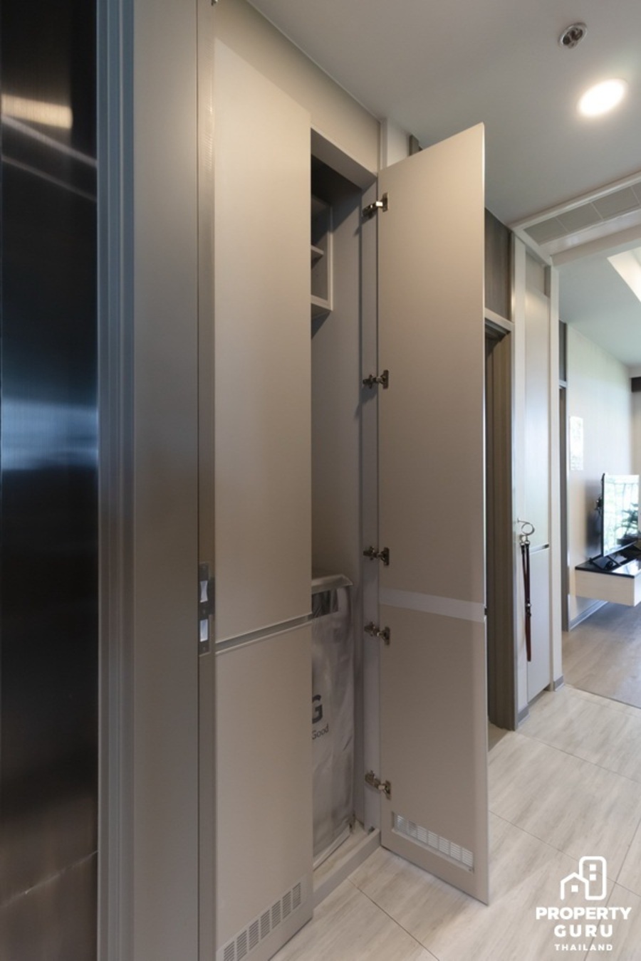 พื้นที่ Foyer ขนาดใหญ่ ได้อารมณ์เหมือนอยู่บ้าน จากภาพทางขวา ทางโครงการ Built-in เป็นตู้สำหรับเก็บของและตู้เก็บรองเท้ามาให้