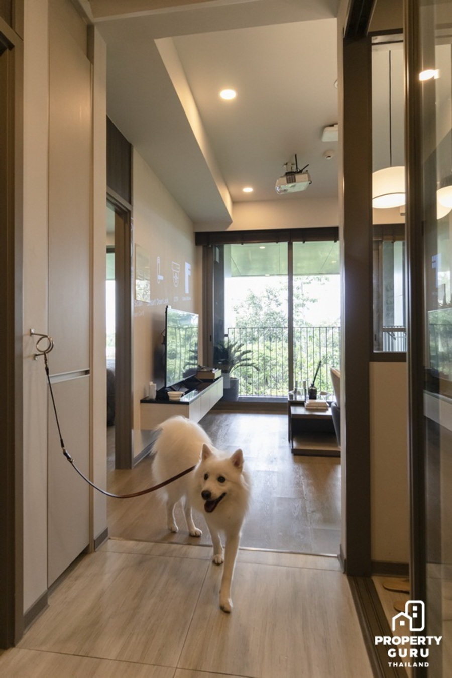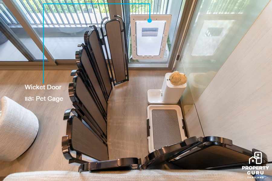 ออกแบบช่องประตูสำหรับสัตว์เลี้ยงโดยเฉพาะ ให้น้องเดินเข้าออกระหว่างระเบียงกับพื้นที่ภายในห้องพักได้อย่างสะดวก และออกไปทำธุระด้านนอก ไม่ก่อให้เกิดกลิ่น และน้องสามารถชมธรรมชาติด้านนอกได้อีกด้วย