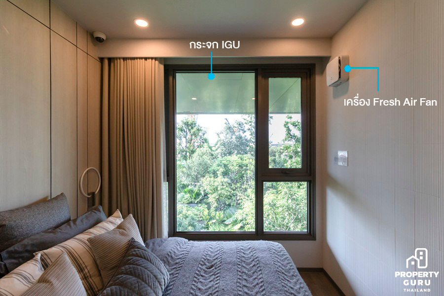 ในทุกๆ ห้อง Master Bedroom จะได้กระจก IGU ช่วยป้องกันเสียงและช่วยป้องกันความร้อนที่สะท้อนเข้ามาภายในห้องนอน พร้อมเครื่อง Fresh Air ที่ช่วยเติมอากาศบริสุทธิ์ผ่านแผ่นกรองอากาศ และยังช่วยกรองฝุ่น PM2.5 ได้มากถึง 90%
