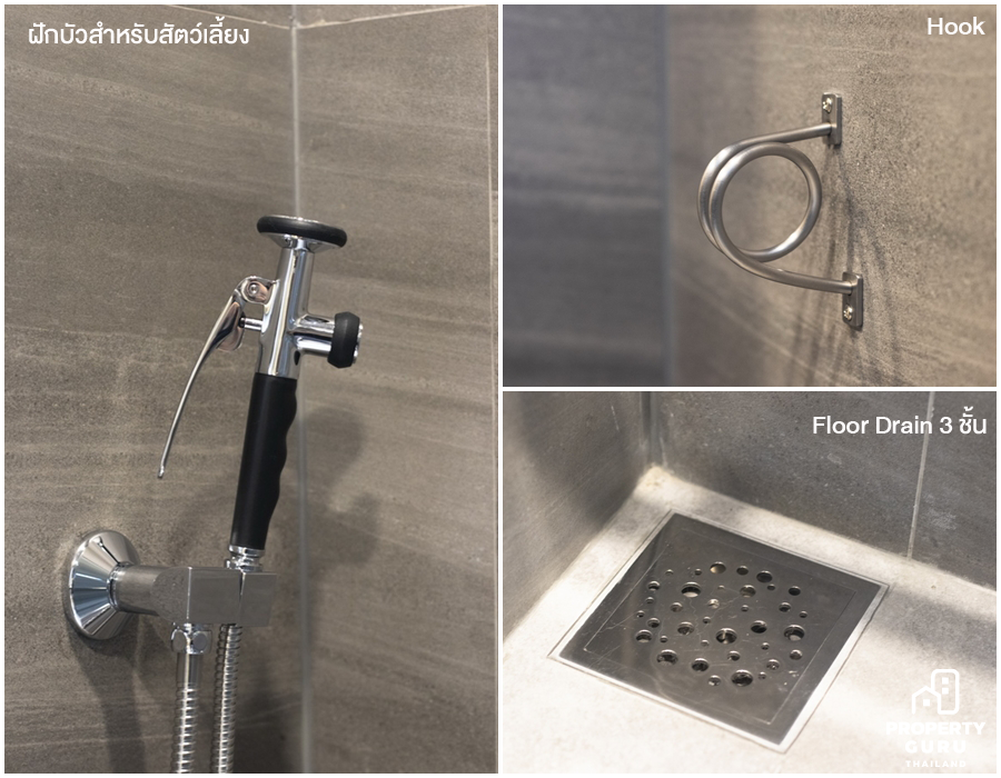 ฝักบัวดีไซน์พิเศษช่วยให้เจ้าของอาบน้ำสัตว์เลี้ยงแบบมือเดียวได้อย่างสะดวก, Floor Drain แบบพิเศษ 3 ชั้น ช่วยในการกรองขนสัตว์ ป้องกันปัญหาท่ออุดตัน และ Hook สำหรับคล้องน้องเวลาที่อาบน้ำ