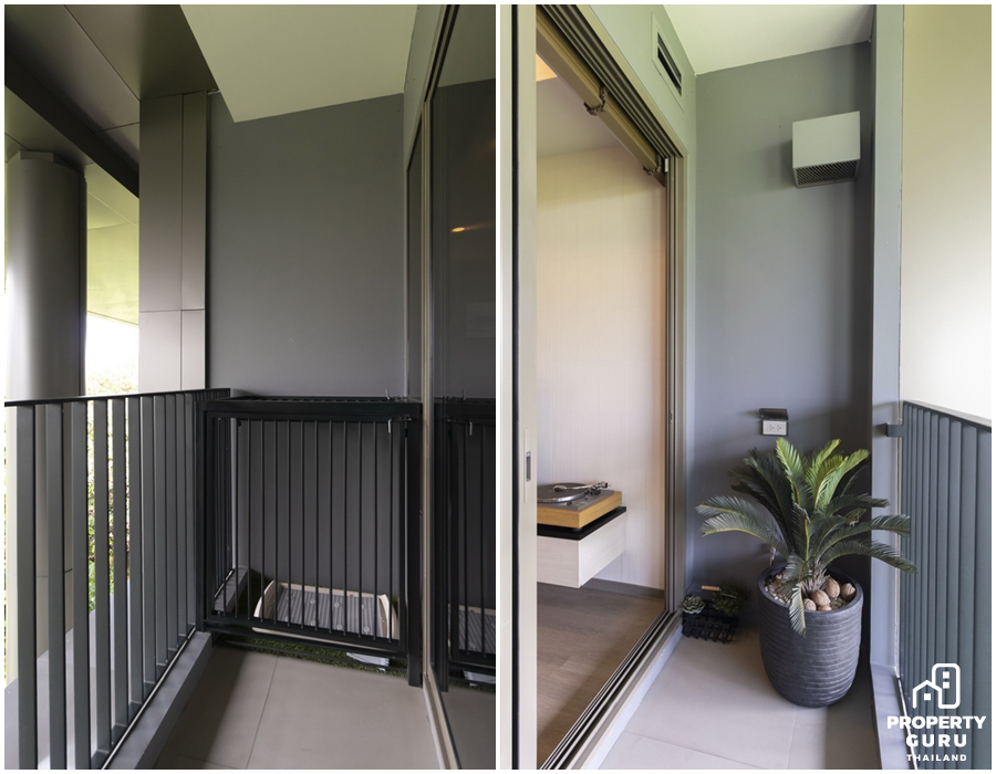 ระเบียงมีความกว้าง 1 เมตร ใช้งานพื้นที่ได้อย่างเต็มที่ และไม่มีคอมเพรสเซอร์แอร์