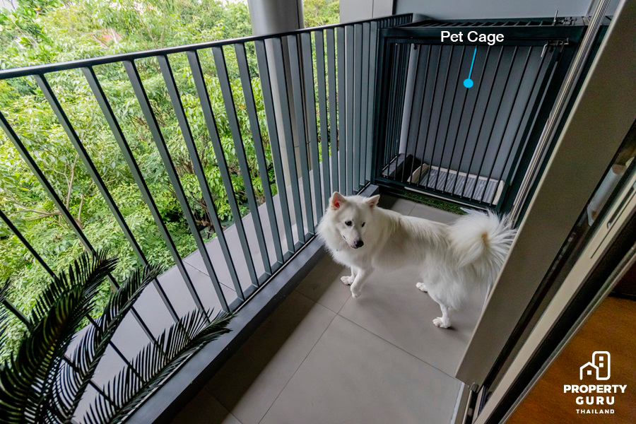 บริเวณระเบียงติดตั้ง Pet Cage ลูกกรงให้สัตว์เลี้ยงออกมานั่งเล่นรับลมที่ระเบียงได้อย่างปลอดภัยถึงแม้เจ้าของจะไม่อยู่ห้องก็ตาม