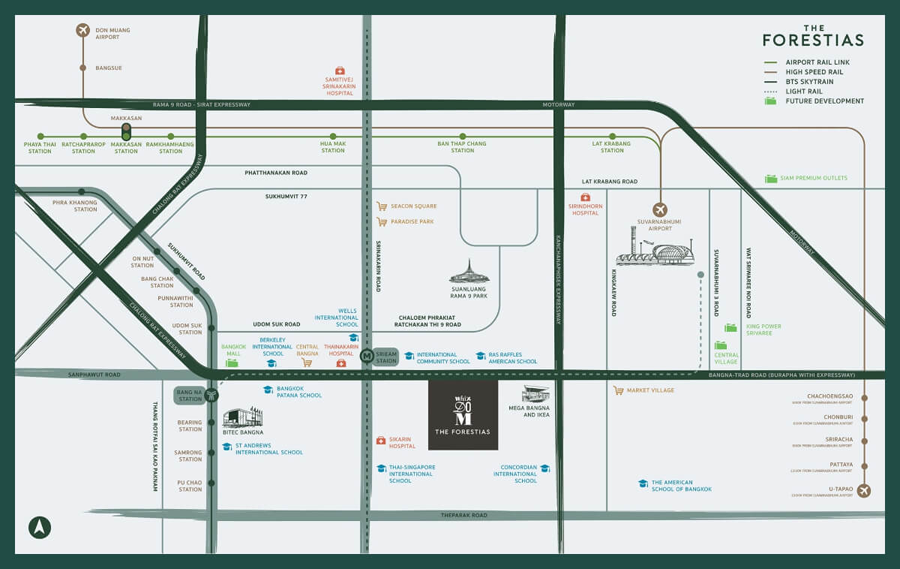 THE FORESTIAS BY MQDC ตั้งอยู่บนถนนบางนา-ตราด กม. 7 ใกล้กับห้างสรรพสินค้า Mega Bangna และสนามบินสุวรรณภูมิ ในอนาคตทำเลบางนายังมีโครงการรถไฟฟ้ารางเบา "LRT บางนา-สุวรรณภูมิ" ที่จะก่อสร้างเชื่อมต่อกับรถไฟฟ้าสายสีเขียวที่ "สถานีบางนา" และเชื่อมต่อกับรถไฟฟ้าสายสีเหลืองที่ "สถานีวัดศรีเอี่ยม"