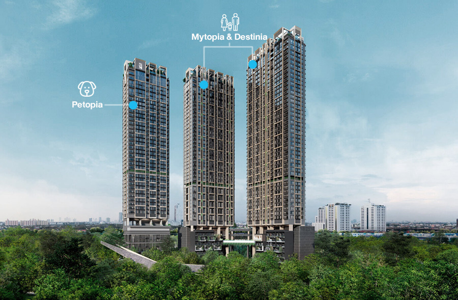 คอนโด High Rise จำนวน 2 อาคาร บนพื้นที่ 5-3-96.2 ไร่ โดยอาคาร Destinia Tower สูง 50 ชั้น และ Mytopia Tower สูง 42 ชั้น รวมทั้ง 2 อาคารมียูนิตพักอาศัย 825 ยูนิต รูปแบบห้องพักอาศัยมีให้เลือกหลากหลาย ตั้งแต่ 1 Bedroom - Duplex Penthouse ขนาดตั้งแต่ 34 - 183 ตร.ม.