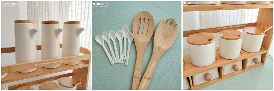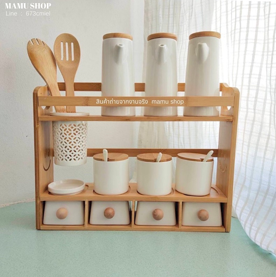 ชุดเครื่องปรุงเซรามิคลายไม้ที่ทำออกมาในสไตล์มินิมอล ในชุดประกอบด้วย ชั้นวางไม้ไผ่ ขวดเเก้วเซรามิค ที่ใส่ช้อนเซรามิค จานรองเซรามิค ที่ใสเครื่องปรุงเซรามิค ช้อนเซรามิค ลิ้นชักเซรามิค ไม้พาย และช้อนตักเครื่องปรุง ขนาดกระทัดรัดเห็นแล้วอยากเข้าครัวทำอาหารขึ้นมาเลย