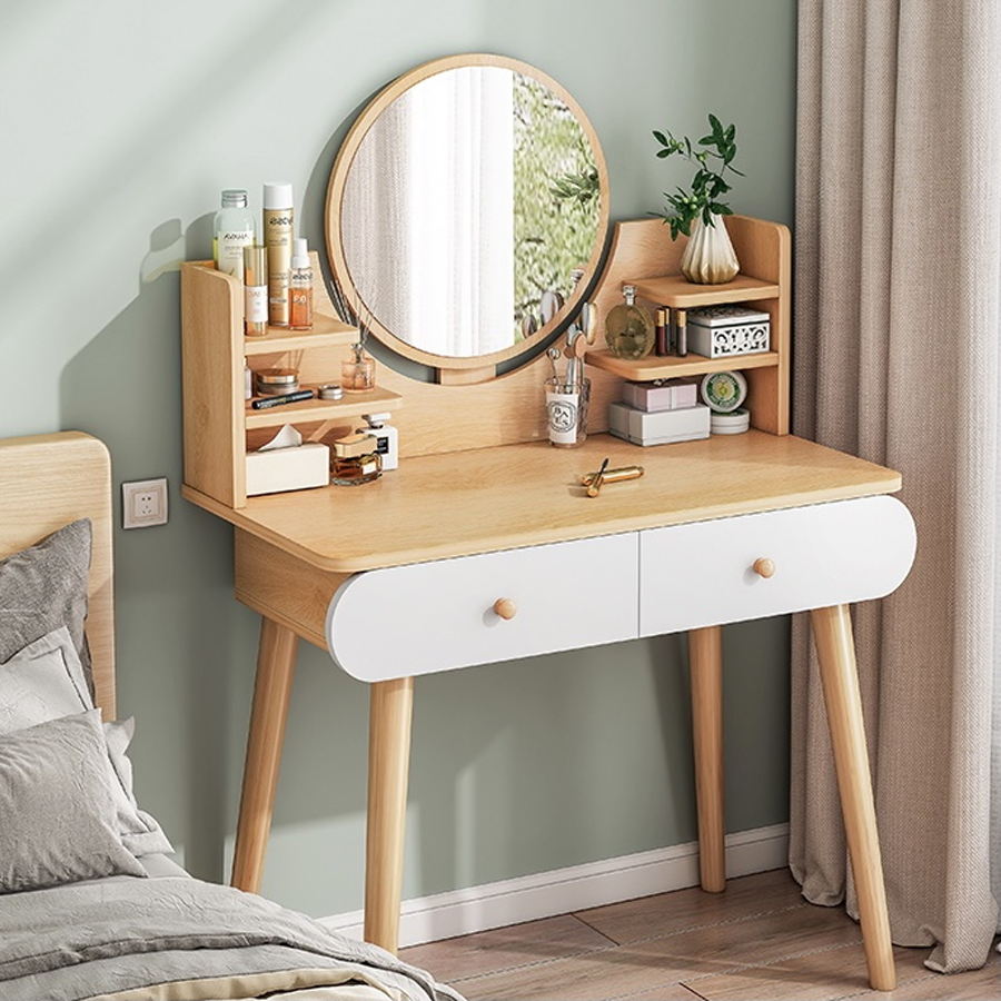 หรือจะวางโต๊ะเครื่องแป้งขนาดกระทัดลัดแบบลอยตัวที่มีดีไซน์เรียบง่ายแต่ดูดีมีสไตล์ ไว้ภายในห้องนอนก็สะดวก อย่างตัวนี้เป็นโต๊ะเครื่องแป้งทรงสูงวัสดุเป็นไม้เนื้อแข็ง มาพร้อมกระจกทรงโค้งมน และชั้นสำหรับให้สาวๆ วางเครื่องสำอาง มีลิ้นชักสำหรับเก็บของต่างๆ และเครื่องประดับได้ เหมาะมากสำหรับห้องนอนขนาดเล็ก