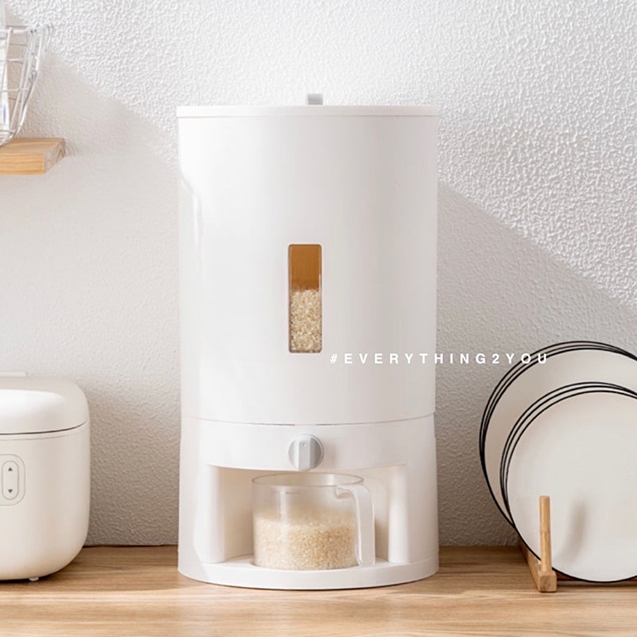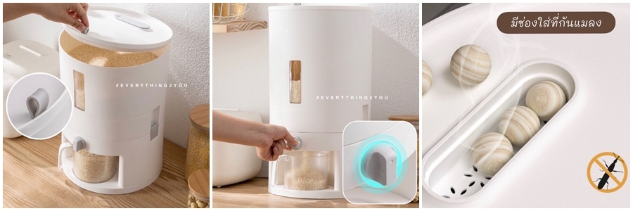 มีหม้อหุงข้าวแล้วก็มาต่อกันที่ถังใส่ข้าวสารสไตล์ญี่ปุ่น ที่ออกแบบให้สามารถใช้งานง่ายไม่ต้องยกหรือเปิดฝาตัก เพียงแค่หมุนเท่านั้น มาพร้อมถ้วยตวงขนาด 500g และพิเศษกับฟังก์ชั่นช่องสำหรับใส่ที่กันมอดและแมลง ช่วยจัดระเบียบห้องครัวให้ดูมินิมอลสุดๆ