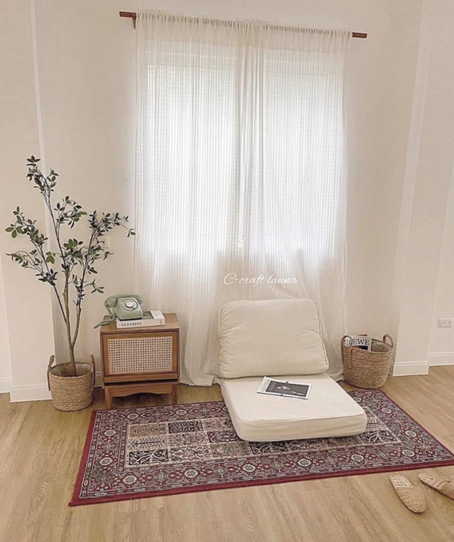 การหาพรมสวยๆ มาปูที่พื้นห้องก็เป็นอีกหนึ่งไอเดียที่ช่วยเปลี่ยนอารมณ์ให้ห้องดูมีมิติที่หลากหลายขึ้นได้แล้ว ส่วนผืนนี้เป็นพรมสีครีม ขนาด 1 x1 เมตร เข้ากันได้ดีกับการแต่งห้องในสไตล์มินิมอล