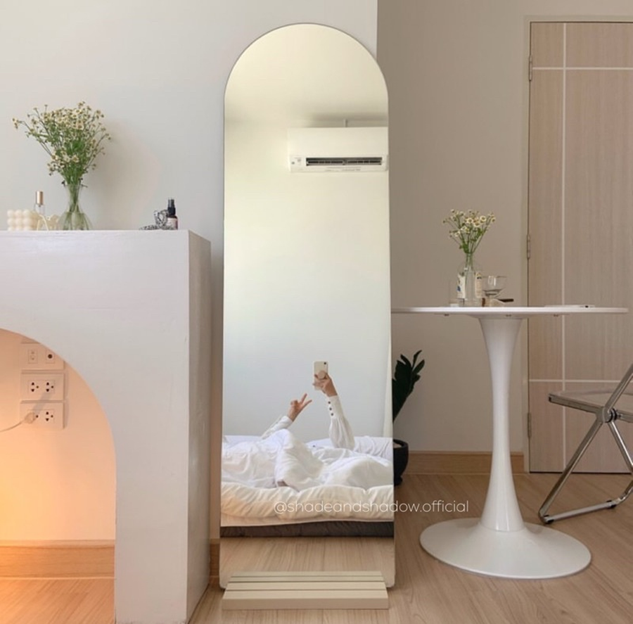 กระจกบานใหญ่แบบไร้ขอบดีไซน์ตัวกระจกโค้งขอบมนสไตล์มินิมอล มาพร้อมกับฐานไม้เพิ่มความปลอดภัย สามารถปรับองศาการวางได้ 3 ระดับตามความต้องการ ส่องสำรวจความสวยงามได้เต็มตัว ไม่จกตา ติดตั้งง่ายเคลื่อนย้ายสะดวก