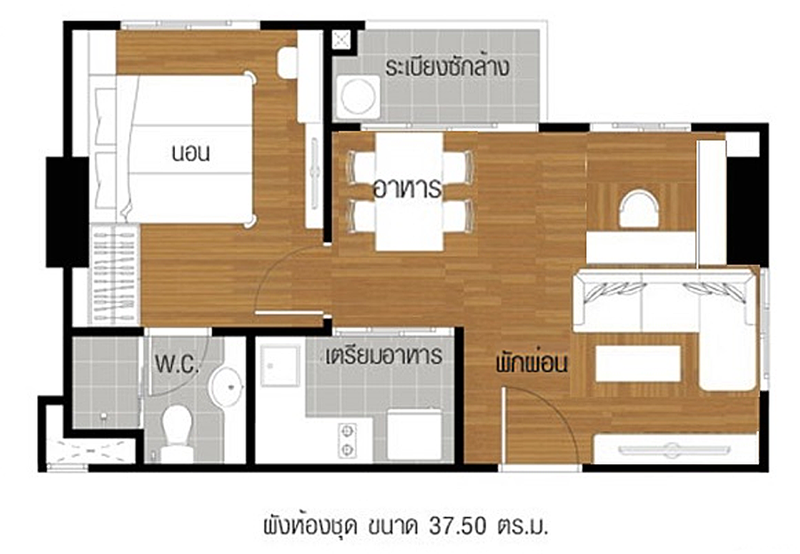 ห้องแบบ 1 ห้องนอนขนาด 37.5 ตร.ม. เป็นห้องตำแหน่งหัวมุมที่มีการจัดแบ่งพื้นที่ฟังก์ชันการใช้งานเป็นสัดส่วน เป็นห้องครัวแบบปิด และแยกห้องนอนชัดเจน