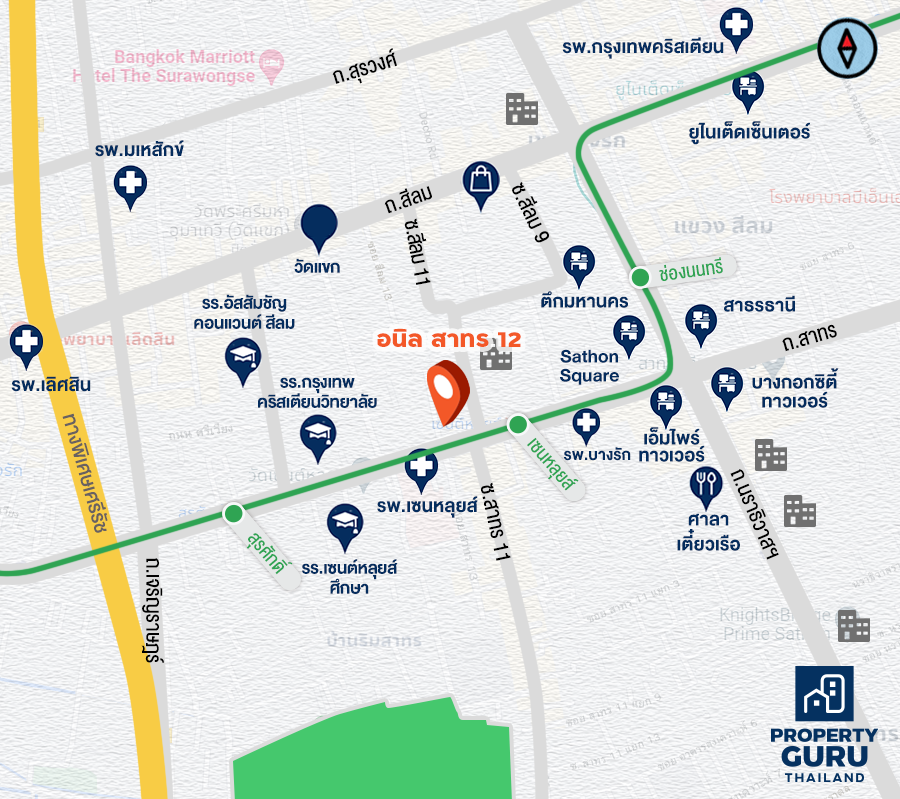 | Hospital โรงพยาบาลเซนต์หลุยส์ 140 ม. โรงพยาบาลบีเอ็นเอช 1.2 กม. โรงพยาบาลเลิดสิน 1.8 กม. | Public Park สวนลุมพินี 2.1 กม. | |