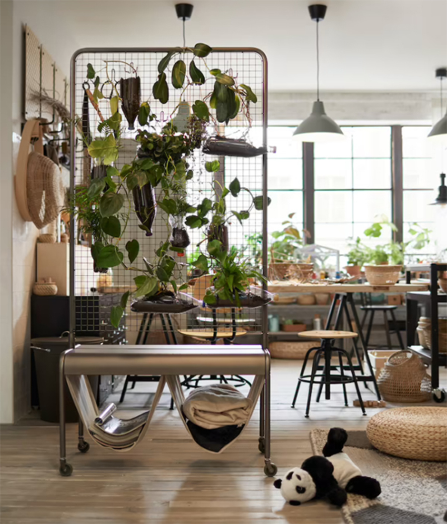 เป็นอีกวิธีที่จะช่วยแบ่งห้องให้เป็นสัดส่วนและสดชื่นคือการกั้นห้องด้วยต้นไม้ค่ะ จะนำต้นไม้วางเรียงกับชั้นวาง หรือจะใช้เป็นไม้เลื้อยกับผนังหรือระแนงก็เก๋ไปอีกแบบ การใช้ต้นไม้จริงในการแบ่งห้องนี้อาจจะต้องศึกษาให้ดีว่าพืชชนิดไหนเหมาะกับการอยู่ในที่ร่ม เพราะไม่เช่นนั้นอาจจะทำให้ผนังต้นไม้ที่เราสร้างขึ้นมาแห้งเหี่ยวจนไม่สามารถสร้างความเป็นส่วนตัวได้ค่ะ
