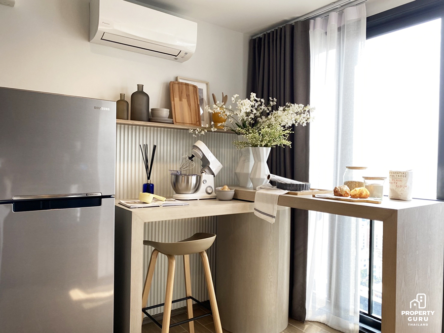 ขนาดครัวตั้งตู้เย็นและวางเคาน์เตอร์ได้แบบนี้เลยค่ะ