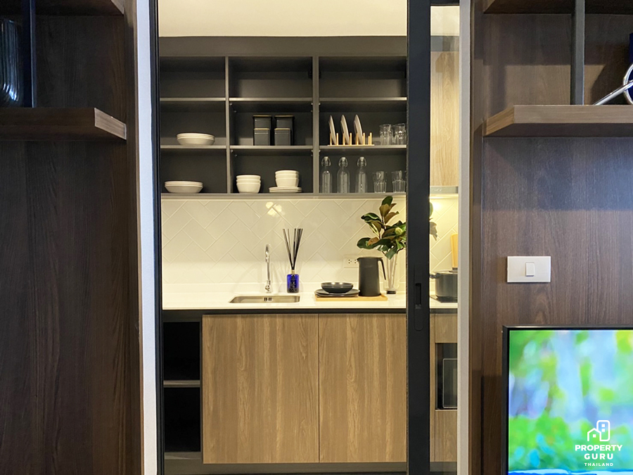 ถัดไปจะเป็นโซนครัวมีประตูบานเลื่อนกั้นที่ค่อนข้างกว้างเลยค่ะ
