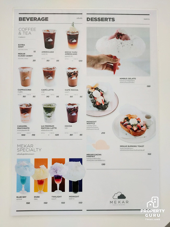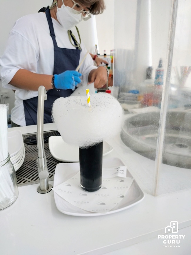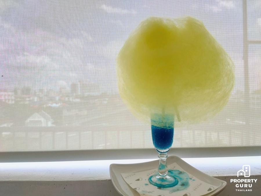 เมนู Signature ของร้าน เมนูแรก "นภากาศ (Blue Sky)" น้ำบลูฮาวายผสมกับส้มยูสุแท้จากญี่ปุ่น ให้รสหวานเปรี้ยวอย่างลงตัว ออนท็อปด้วยสายไหมสีฟ้า ตัวแทนของวันที่ท้องฟ้าสดใส