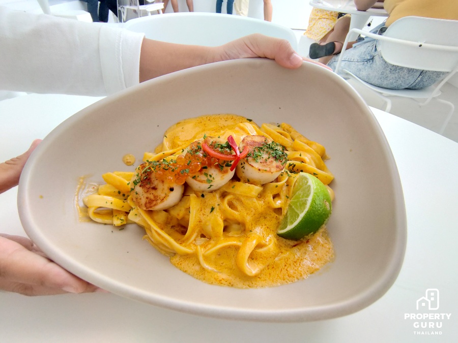 เฟตตูชินี่ราดด้วยซอสต้มยำกุ้งครีมมี่สูตรพิเศษ เสิร์ฟคู่กับหอยเชลล์ย่างคำโต โรยด้วยไข่ปลาแซลมอน เป็นอีกหนึ่งจานที่อยากให้ลอง