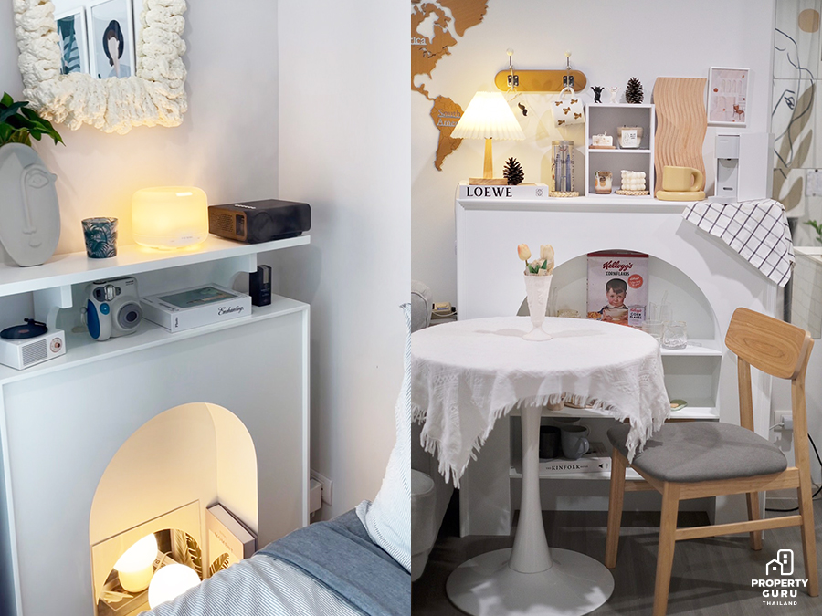 โมเป็นคนขี้เบื่อค่ะ ชอบเปลี่ยนมุมไปเรื่อยเลย เวลาเห็นอะไรน่ารักก็ต้องจัดตามเทรนด์ และถ้าเราบิวท์อินก็จะมีค่าใช้จ่ายเป็นก้อนที่เพิ่มขึ้นด้วยประมาณ 3-4 แสนบาท ช่วงเศรษฐกิจไม่ดีแบบนี้ก็ต้องเซฟๆ กันหน่อย ดังนั้นเราก็เอาเงินไปซื้อเฟอร์นิเจอร์ลอยตัว ของใช้ เครื่องใช้ไฟฟ้าได้สบายๆ เลย หรือถ้าอยากแต่งเพิ่มก็ทยอยซื้อเข้ามาเรื่อยๆ ได้ ซึ่ง Item ที่โมจิชอบที่สุดจนต้องซื้อมา 2 อัน ก็คือเตาผิงเกาหลีมินิมอล หรือชั้นวางของสีขาวโค้งๆ ที่คุ้นหน้าคุ้นตากันค่ะ คนรักการแต่งห้องมินิมอลเกาหลีแบบโมต้องไม่พลาด คือทำให้ห้องสวยน่ารักละมุนขึ้นมาก ใช้สำหรับวางของตกแต่งสวยๆ ไม่เหมาะกับการเก็บของใดๆ นะคะ