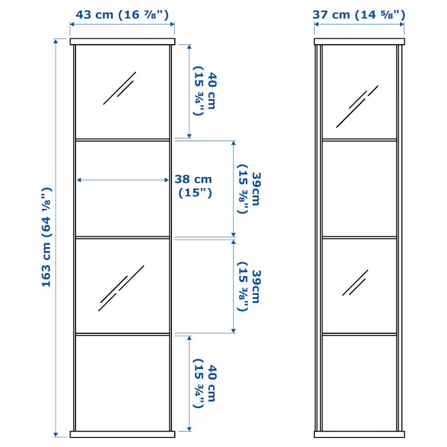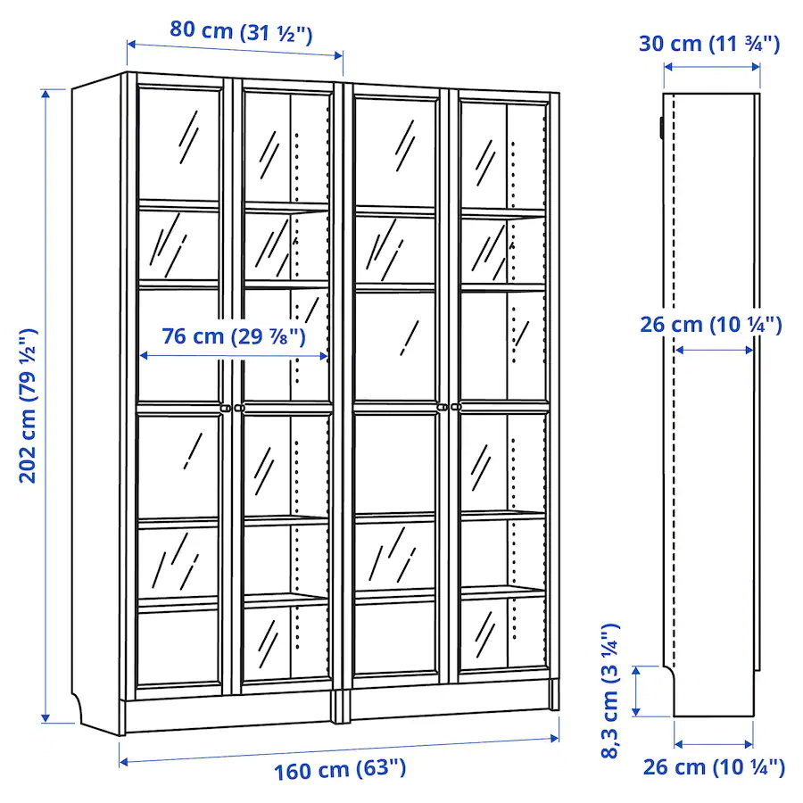 BILLY บิลลี่ / OXBERG อ็อกเบรย์ ตู้หนังสือ ตู้โชว์ สีขาว/แก้ว ขนาด 160x30x202 ซม. ส่วนบานกระจกใช้เป็นตู้โชว์ เก็บของชิ้นโปรดให้สะอาดไร้ฝุ่น บานพับปรับใช้ได้ทั้งแนวตั้งและแนวนอน ต้องยึดเฟอร์นิเจอร์ติดผนังด้วยแถบผ้าหรืออุปกรณ์ที่ให้มา โดยใช้คู่กับสกรูที่เหมาะกับผนัง ใช้กระจกนิรภัยอย่างระมัดระวัง หากขอบกระจกบิ่นหรือเกิดรอยขีดข่วนบนผิว อาจทำให้กระจกแตกหักได้ทันที ระวังการกระแทกด้านข้างของกระจก เพราะเป็นส่วนที่แตกง่ายที่สุด วัสดุผนังแต่ละแบบ ต้องใช้สกรูยึดต่างชนิดกัน ควรเลือกใช้สกรูที่เหมาะกับผนังนั้น (สกรูแยกจำหน่าย) เพดานห้องที่ประกอบตู้ต้องสูงอย่างน้อย 205 ซม.