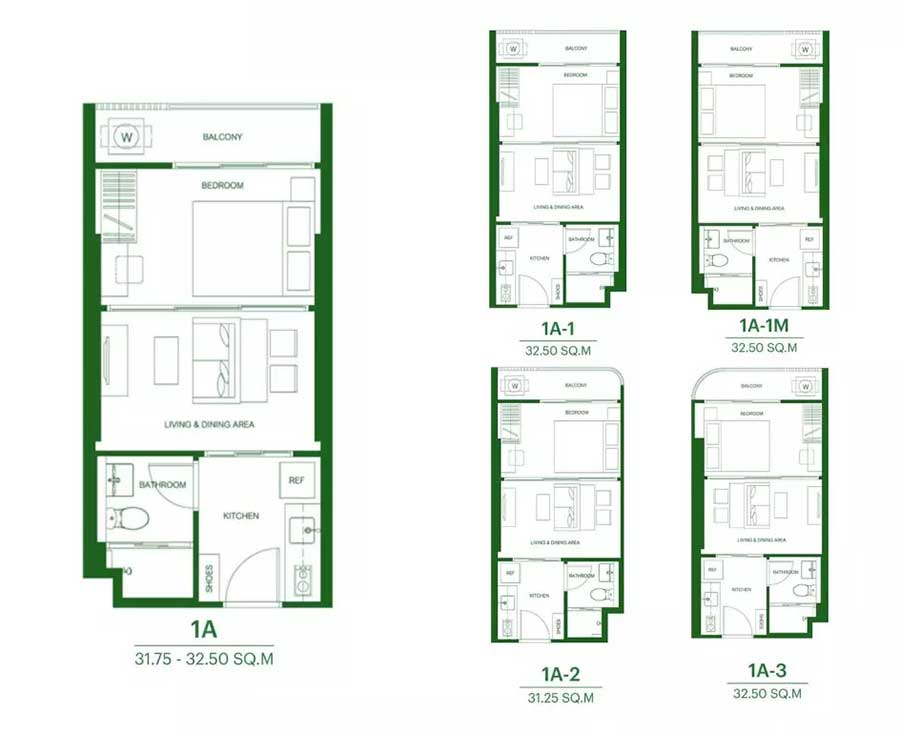 - 1 ห้องนอน 1 ห้องน้ำ ขนาด 31.75 - 36.75 ตร.ม.