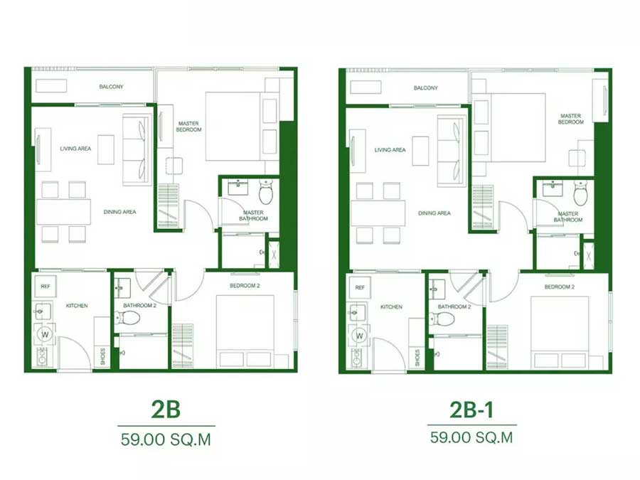 - 2 ห้องนอน 2 ห้องน้ำ ขนาด 56.5 - 73.5 ตร.ม.