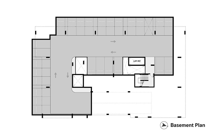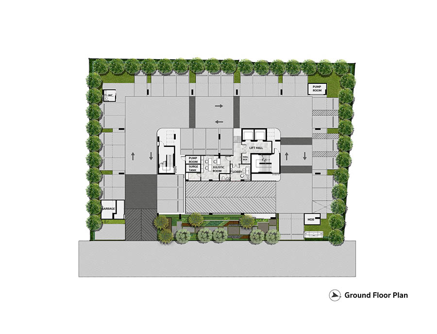 จอดรถที่ชั้นใต้ดินและชั้น 1 ส่วนที่เว้าเข้าไปเป็นพื้นที่ของสระว่ายน้ำที่ชั้น 2
