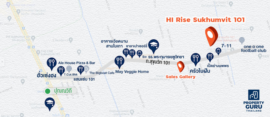 จุดเด่นอีก 1 อย่างของซอยสุขุมวิท 101 ก็คือ มี Street Food และร้านสะดวกซื้อกระจายอยู่ตลอดทั้งซอย ทำให้ซอยมีบรรยากาศที่คึกคัก ไม่เปลี่ยว ตัวโครงการตั้งอยู่ที่ซอยปุณณวิถี 39 ปากซอยมีเซเว่น อิเลฟเว่น และร้านอาหารอยู่หลายร้าน ส่วนสำนักงานขายจะตั้งอยู่ที่ ซอยปุณณวิถี 28 ค่ะ