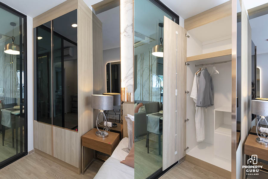 ฝั่งตรงข้ามตู้สามารถตั้งโต๊ะเครื่องแป้งได้ค่ะ แต่อาจจะไม่ได้ใหญ่มากเพราะจะขวางทางเดินของเราเอง