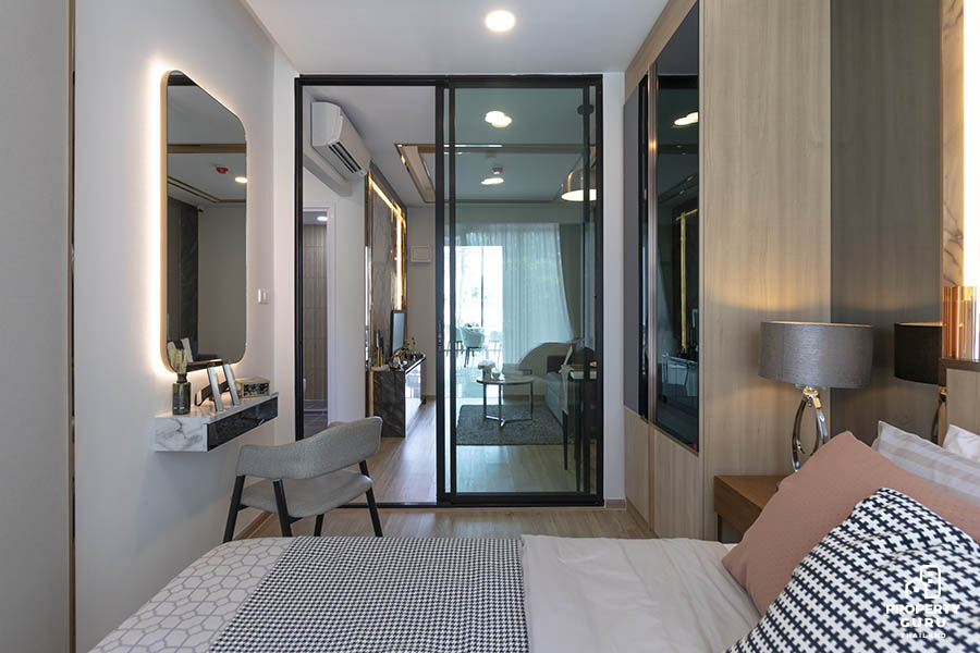 ประตูห้องนอนเป็นประตูบานเลื่อน 2 ตอน ขอบเป็นอลูมิเนียมสีดำ
