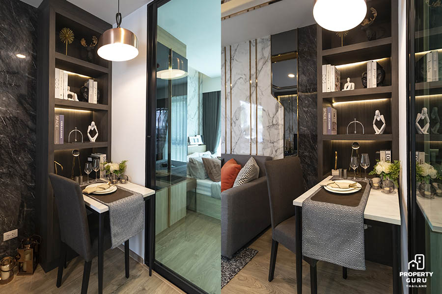 บริเวณหน้าห้องนอนมีพื้นที่เหลือสำหรับวางโต๊ะรับประทานอาหารขนาดไม่เกิน 4 ที่ได้
