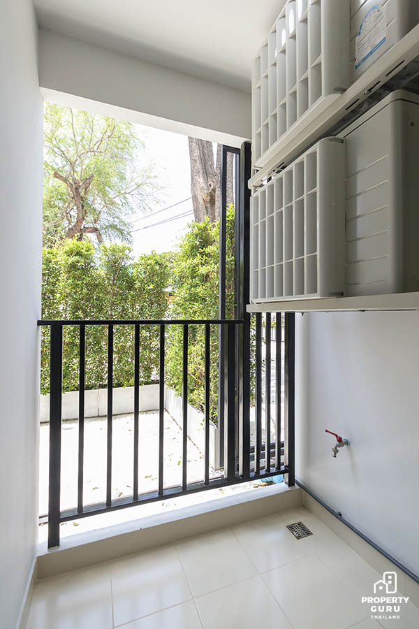 ตรงระเบียงด้านบนจะเป็นพื้นที่แขวนคอมเพรสเซอร์แอร์ ส่วนด้านล่างก็จะมีปลั๊กและก๊อกน้ำสำหรับติดตั้งเครื่องซักผ้า
