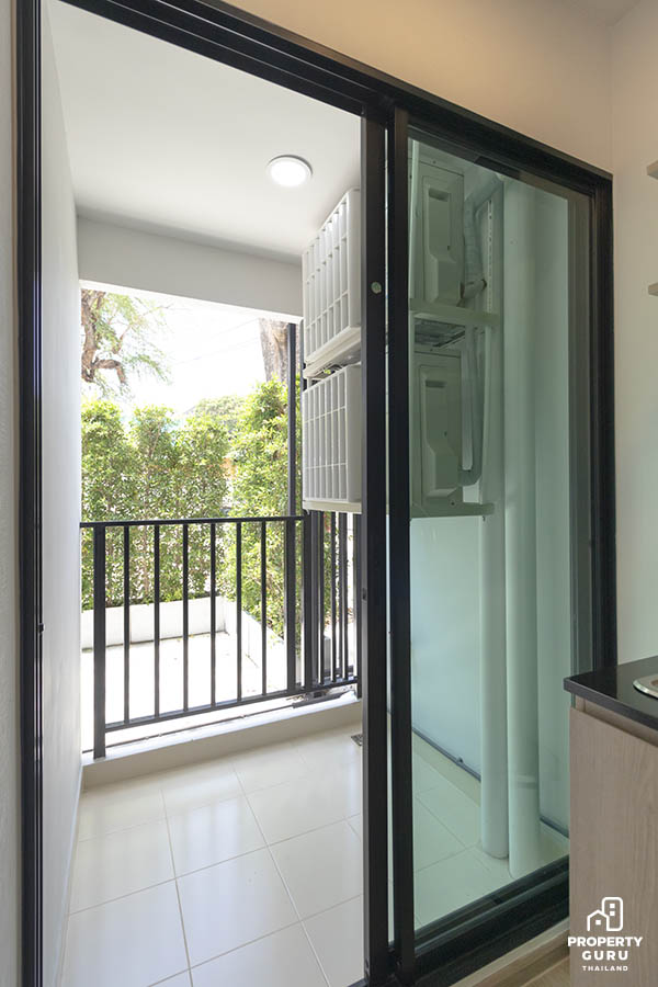 ถัดจากครัวก็จะเป็นระเบียง โดยจะกั้นด้วยประตูบานสไลด์ 2 ตอน เปิดระบายอากาศในวันที่ทำอาหารได้