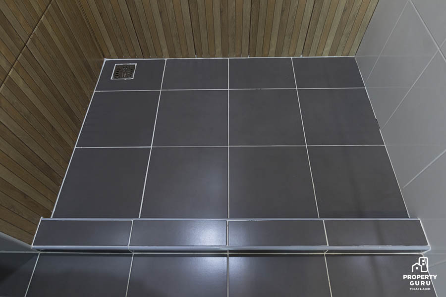 พื้นของห้องเป็นกระเบื้องยาง SPC ทนทาน สีได้ตามห้องตัวอย่างหรือใกล้เคียง