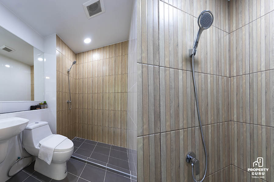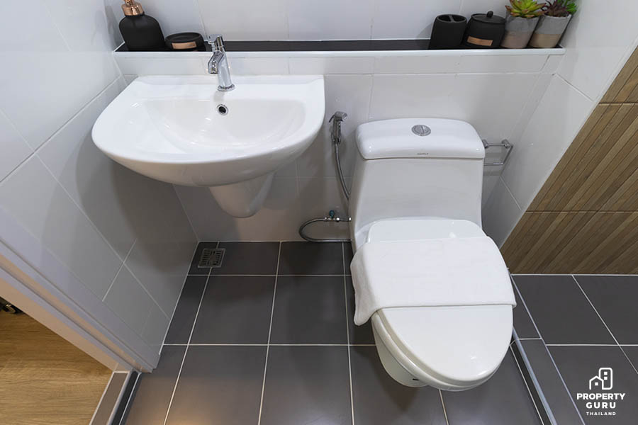 ภายในห้องน้ำโครงการจะให้อ่างล้างหน้า โถสุขภัณฑ์ ฝักบัว สายฉีดชำระ ยี่ห้อ Hafele