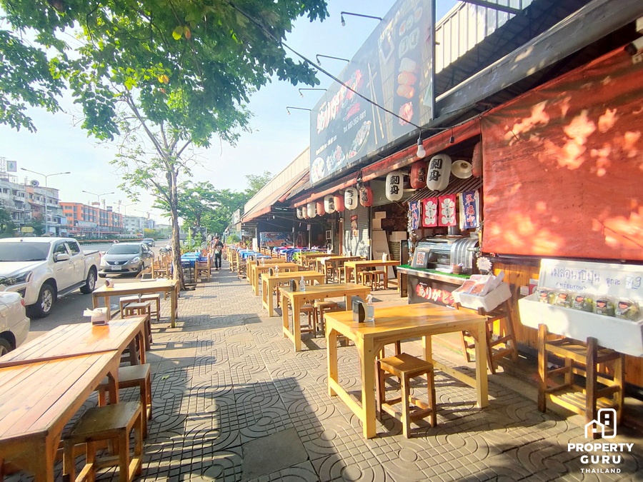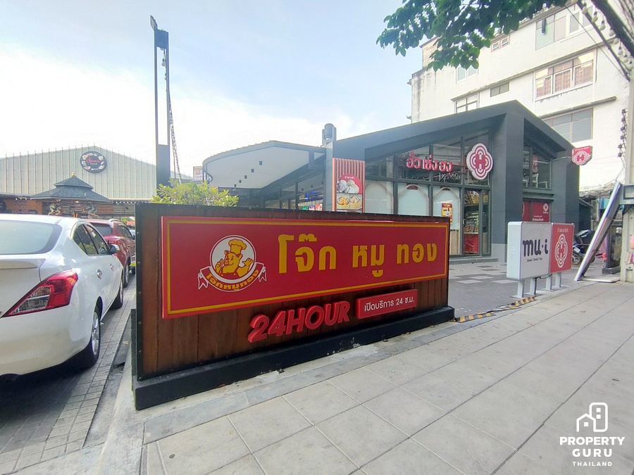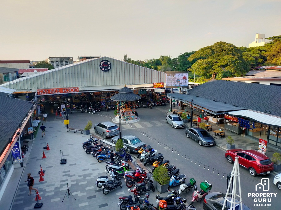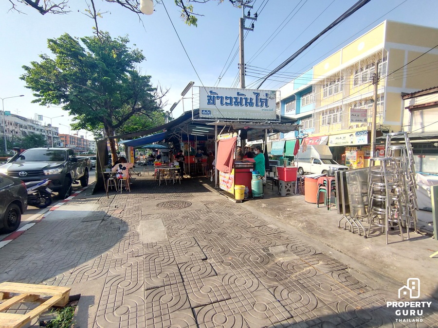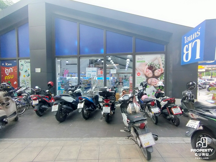 ถัดมาอีกก็จะเป็นแนวอาคารพาณิชย์ มีร้านไก่ย่าง 5 ดาว มีร้านทำผม ร้านกาแฟ อยู่ใกล้ปายรถประจำทาง