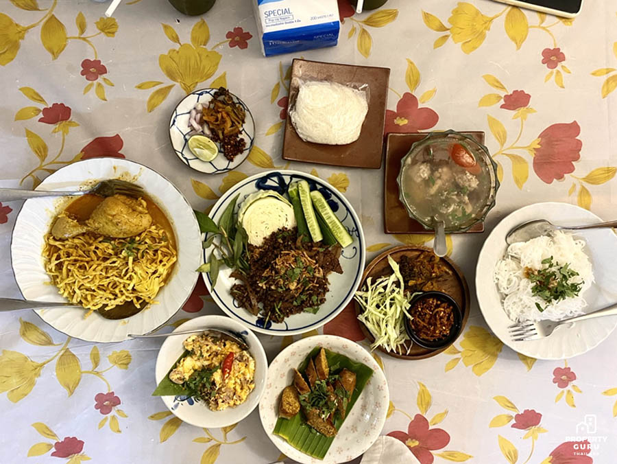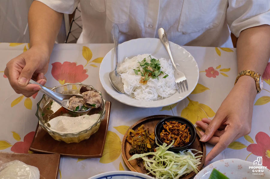 น้ำขนมจีนจะใสคล้ายแกงจืด มีกระดูกหมู เลือด มะเขือเทศ และผักชีโรยหน้ารสชาติกลมกล่อม อมเปรี้ยวนิดๆ และหอมกระเทียมเจียว