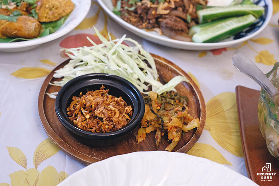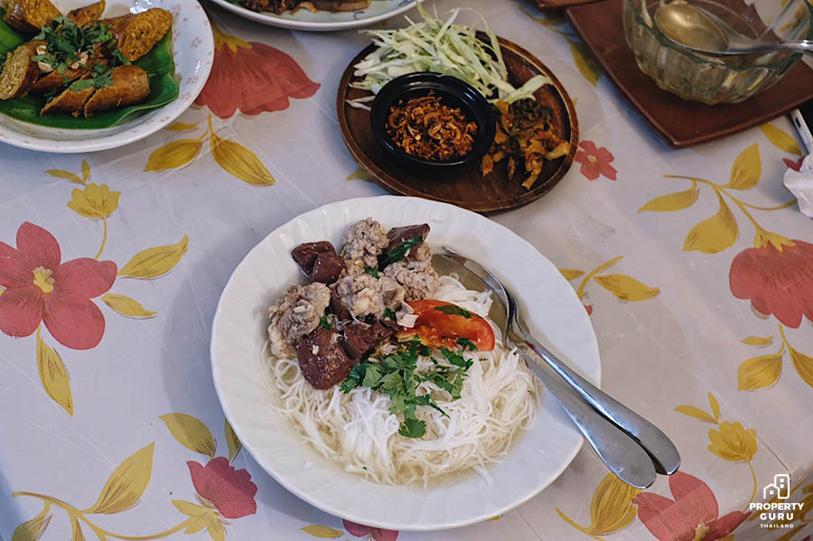 น้ำขนมจีนจะใสคล้ายแกงจืด มีกระดูกหมู เลือด มะเขือเทศ และผักชีโรยหน้ารสชาติกลมกล่อม อมเปรี้ยวนิดๆ และหอมกระเทียมเจียว