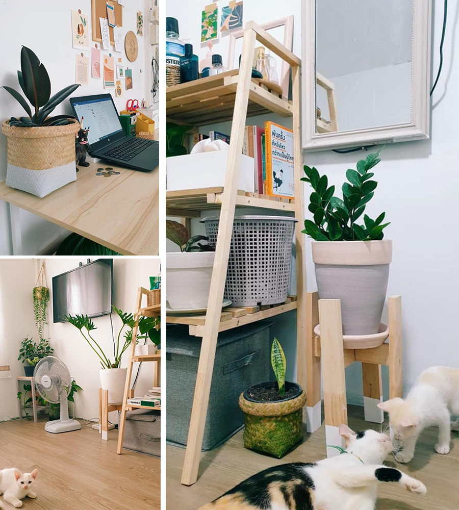 ฐานไม้ตั้งกระถาง และชั้นวางไม้ก็เป็นงาน DIY เช่นกัน