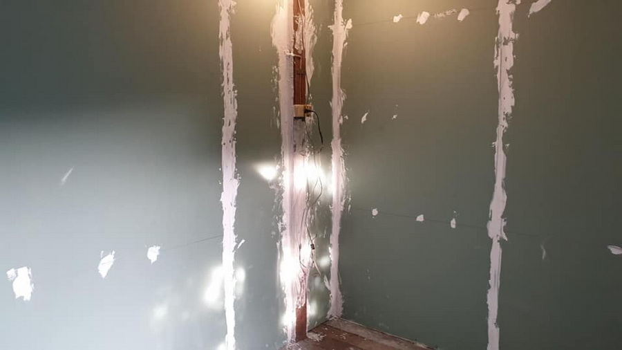 หลังจากนั้นเราใช้เวลาที่เหลือของวันตั้งแต่หกโมงเย็นในการยาแนวขอบด้วยผงยิปซั่มพร้อมทาสีเอง