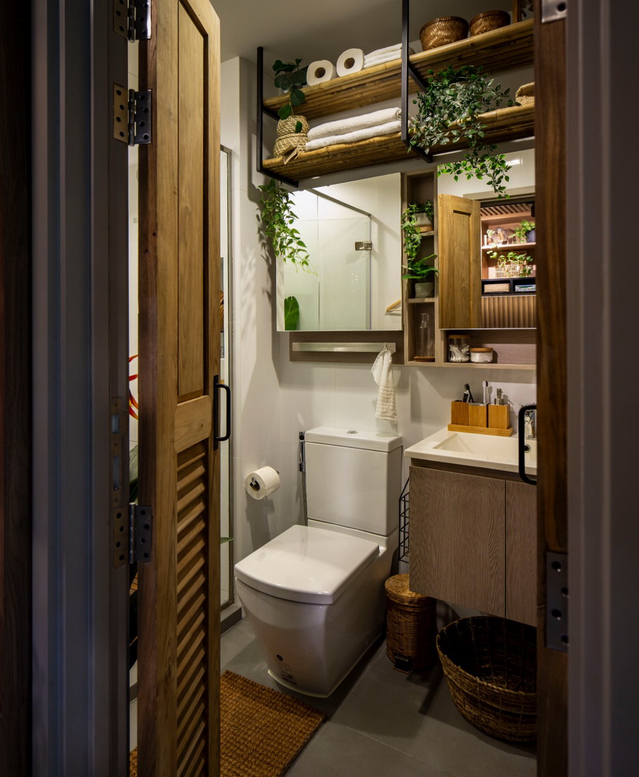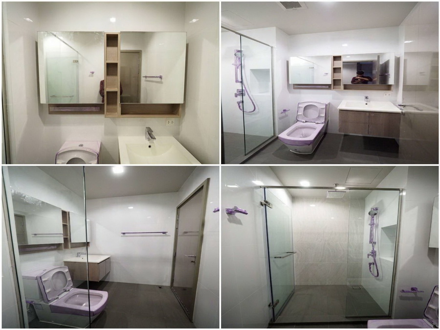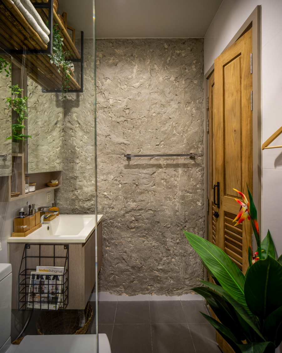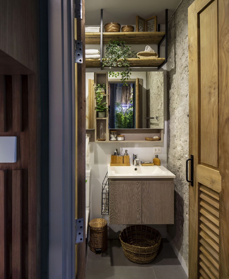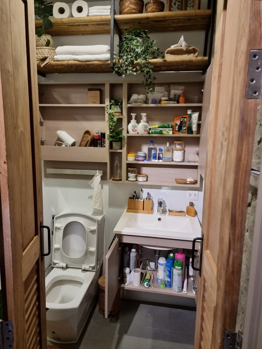 ถัดไป ห้องน้ำ จากกระทู้เดิมจะไม่ได้โฟกัสอะไรเลยเพราะแทบไม่ได้ทำอะไรเพิ่ม แค่ใส่พรอพเล็กๆน้อยๆ แต่คราวนี้ค่อนข้างจัดเพิ่มเข้าไปเยอะอยู่ครับ เริ่มด้วย บานประตูห้องเลย(6) เปลี่ยนจากเดิมของโครงการที่เป็นบานเดี่ยว เป็นประตูไม้สักแบบบานคู่ ตามที่เราจะเห็นใช้กันเยอะๆตามที่พักตากอากาศ เพื่อต้องการให้ได้บรรยากาศเหมือนได้พักผ่อนตามว่าครับ ส่วนสีคือแจ้งเขาเลยครับว่าอยากได้แบบ ดิบๆเลย ไม่ต้องทาเคลือบเงาอะไรเลย เพราะเราก็ไม่ได้ใช้งานกลางแจ้งโดนแดดหรือโดนน้ำอะไรอยู่แล้ว