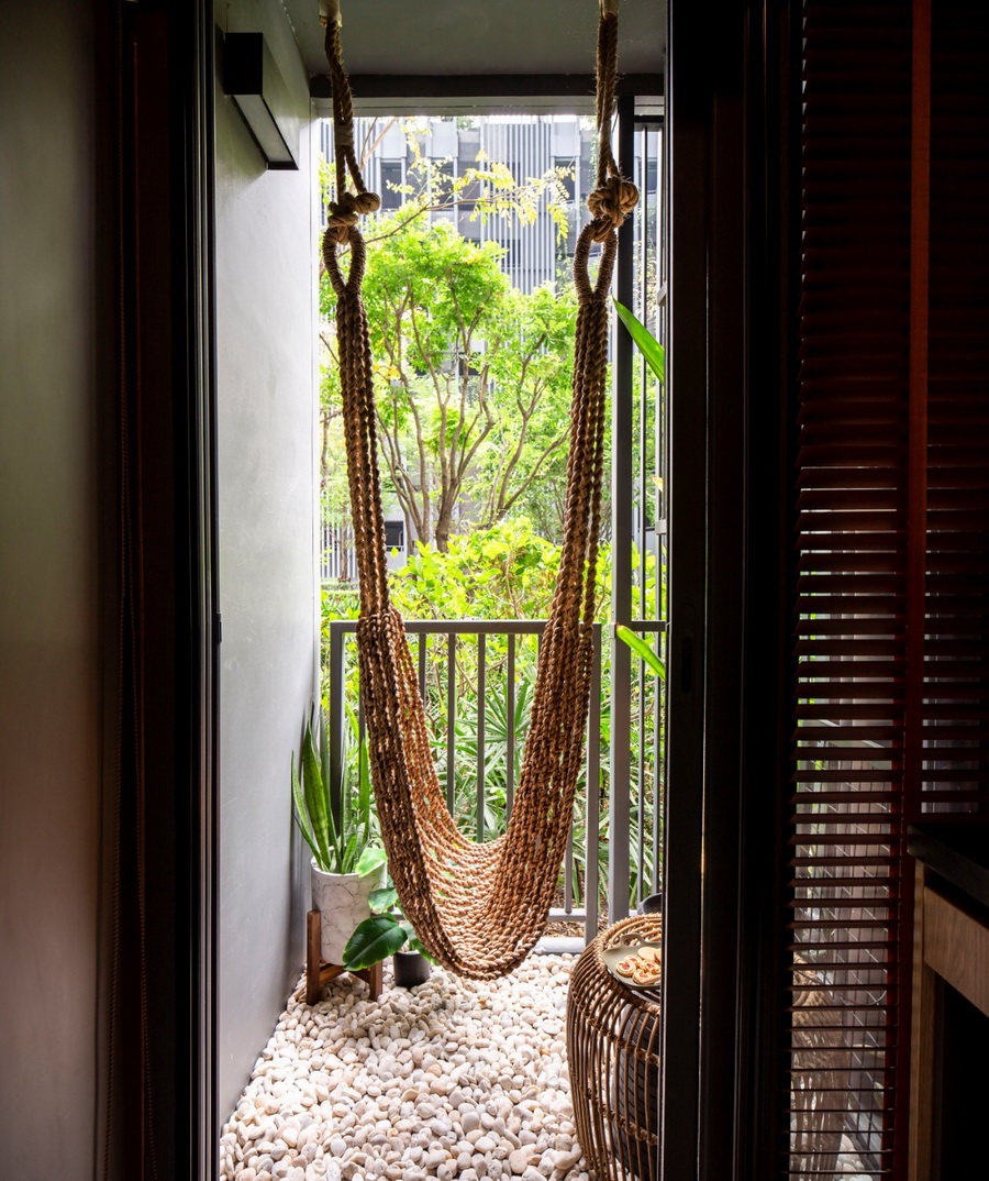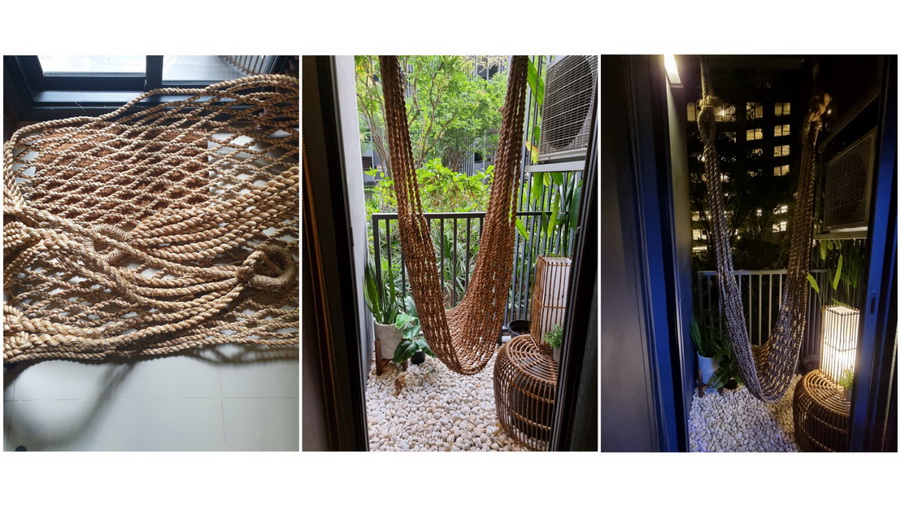 ต่อมาติดกันกับส่วนครัวจะเป็นระเบียง ที่เพิ่มมาก็คือตัว กระเช้าเปลและหินกรวด(5) ครับ จริงๆส่วนนี้ก็ไม่ค่อยได้ใช้งานเท่าไหร่ แต่ถ้าว่างแบบว่างจริงจังละอากาศเย็นๆหน้าหนาว ออกไปนั่งไกวก็พอได้อยู่ ซึ่งตามเดิมแล้วตัวนี้จะเป็นเปลนอนแขวนแบบยาวเลยครับ เนื่องจากพื้นที่จำกัดและทางร้านก็มีเฉพาะแบบนี้เลยต้องอะแดปติดแขวนห้อยอย่างนี้แบบเป็นที่นั่งแทน